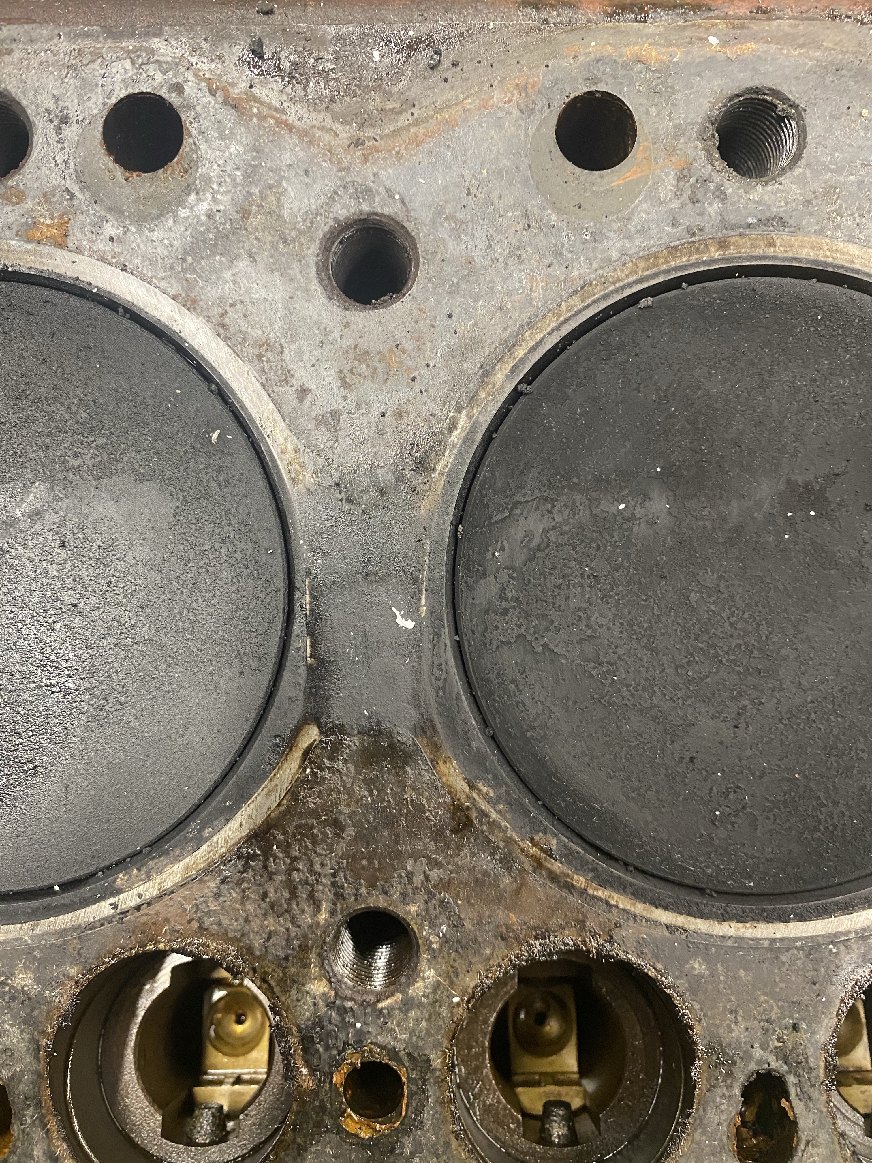 Head looks ok (no obvious cracks between 2 and 3) and given the thick layer of carbon came off the valves I started thinking this may equate to more horses and would it be worth also porting the head. At this point I started cleaning the pistons. Scraping, spraying, scraping and spraying and scrubbing and they were coming up well until ….