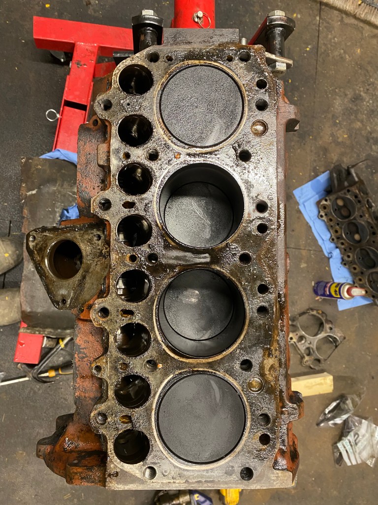 A little bit of tidying of the workshop was required before moving onto cleaning the block, and starting to clean the head (I’ll start stripping that later once I have tidied a bench) and the pistons.